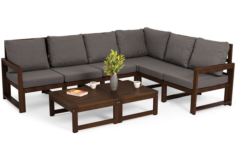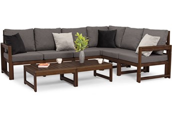 Drewniany narożnik ogrodowy MALTA XXL dla 6 osób w zestawie z dwoma stolikami kawowymi. Zestaw utrzymany w nowoczesnym stylu skandynawskim. Dodatkowo krzesła i oparcia posiadają grube poduszki. Narożnik jest modułowy i uniwersalny – można go zamontować zarówno z lewej, jak i prawej strony. Daje to doskonałe możliwości organizacji i dostosowania do dostępnej przestrzeni. Nowoczesny narożnik w minimalistycznym stylu MALTA to połączenie naturalnych materiałów i klasycznej bryły narożnika. Drewniane meble idealnie sprawdzą się w nasłonecznionych częściach ogrodu, tarasu czy balkonu. Funkcjonalna sofa jest bardzo wygodna i stabilna, posiada ryflowane siedziska, które po wyjęciu poduszek wyglądają bardzo elegancko. Zestaw uzupełniają dwie niskie ławki, które mogą służyć jako podnóżki.