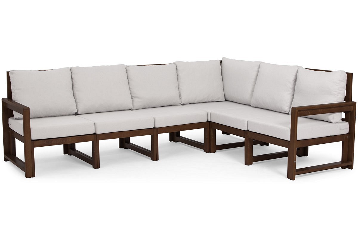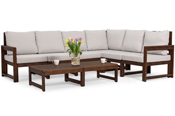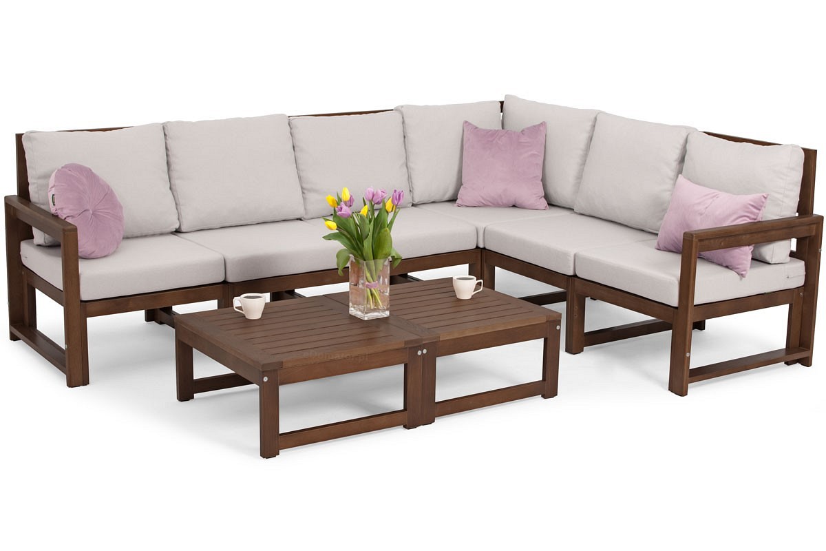 Drewniany narożnik ogrodowy MALTA XXL dla 6 osób w zestawie z dwoma stolikami kawowymi. Zestaw utrzymany w nowoczesnym stylu skandynawskim. Dodatkowo krzesła i oparcia posiadają grube poduszki. Narożnik jest modułowy i uniwersalny – można go zamontować zarówno z lewej, jak i prawej strony. Daje to doskonałe możliwości organizacji i dostosowania do dostępnej przestrzeni. Nowoczesny narożnik w minimalistycznym stylu MALTA to połączenie naturalnych materiałów i klasycznej bryły narożnika. Drewniane meble idealnie sprawdzą się w nasłonecznionych częściach ogrodu, tarasu czy balkonu. Funkcjonalna sofa jest bardzo wygodna i stabilna, posiada ryflowane siedziska, które po wyjęciu poduszek wyglądają bardzo elegancko. Zestaw uzupełniają dwie niskie ławki, które mogą służyć jako podnóżki.