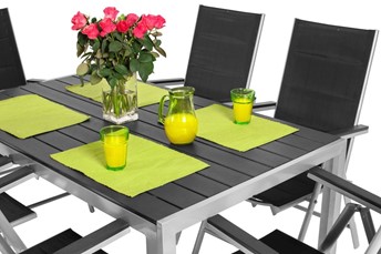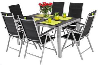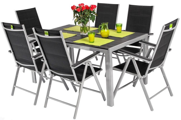 Meble MODENA składają się z dużego stołu o wymiarach 150 x 90 cm oraz sześciu składanych krzeseł. To meble ogrodowe wykonane z wysokiej jakości materiałów. Doskonale sprawdzą się jako meble ogrodowe, tarasowe czy balkonowe w okresie wiosenno-letnim. Ramy mebli wykonane są z aluminium malowanego proszkowo z delikatnym satynowym wykończeniem. Nadaje meblom eleganckiego i nowoczesnego stylu, który jest bardzo popularny w nowoczesnym designie. Rama jest odporna na wodę i korozję, dzięki czemu meble mogą stać na deszczu bez obawy o uszkodzenia.