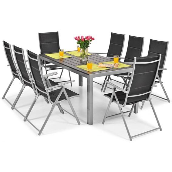 Zestaw mebli ogrodowych Modena Max dla 8 osób w kolorze czarnym to doskonały wybór dla tych, którzy cenią sobie elegancję i trwałość. Zestaw, wykonany z wytrzymałego aluminium, jest odporny na działanie warunków atmosferycznych, co sprawia, że doskonale sprawdzi się w każdej zewnętrznej przestrzeni. Czarny kolor i minimalistyczny design nadają mu nowoczesny charakter, który łatwo dopasować do różnych stylów aranżacji. Składający się z przestronnego stołu i ośmiu krzeseł, zestaw Modena Max zapewnia komfortowe miejsce do wspólnych posiłków i spotkań towarzyskich na świeżym powietrzu.