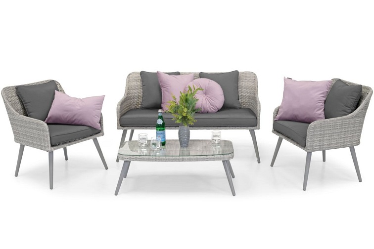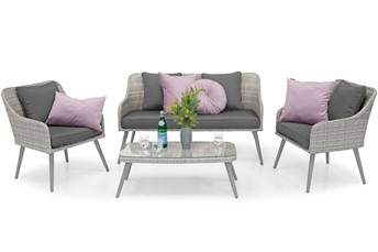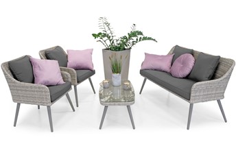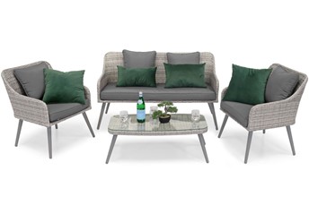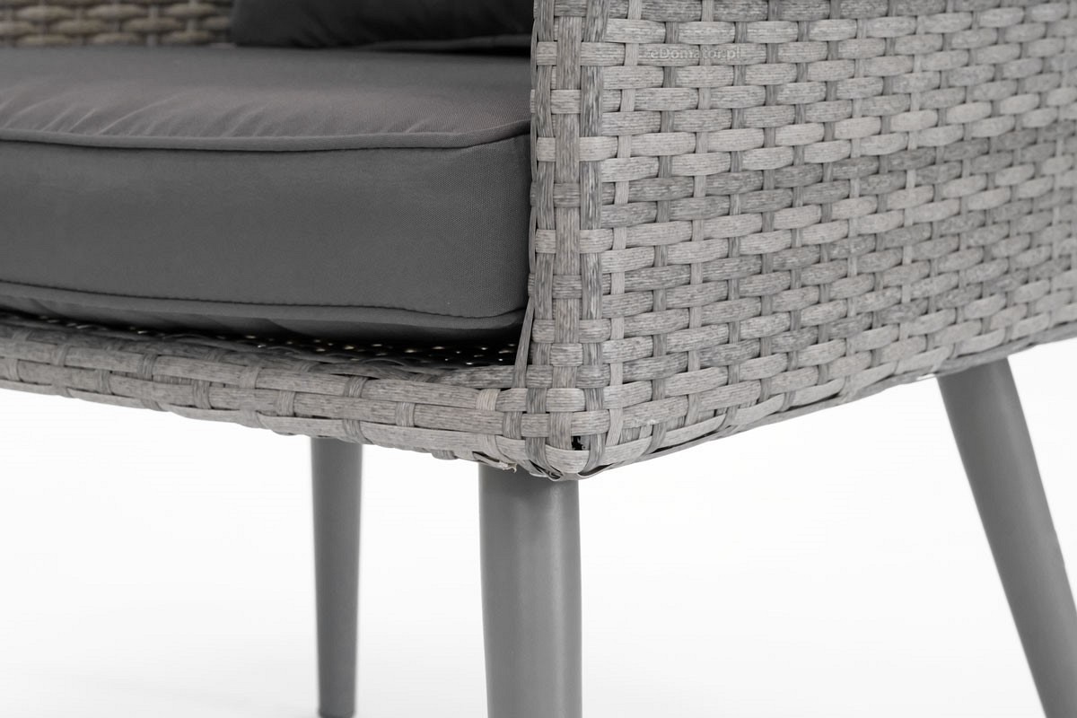 Eleganckie meble ogrodowe z rattanu syntetycznego MOKKA to idealny wybór na kącik wypoczynkowy w Twoim ogrodzie. Zestaw balkonowy dla 4 osób z niskim stolikiem kawowym, dwoma wygodnymi fotelami i szeroką sofą ogrodową. Mebel doskonale nadaje się do użytku na zewnątrz. Charakteryzują się wysoką odpornością na wodę i promieniowanie UV. Konstrukcja zestawu ogrodowego oparta jest na mocnym metalowym stelażu, który zapewnia doskonałą stabilność. Krzesło i sofa Focal wytrzymują obciążenie do 120 kg na osobę/miejsce. Ramy mebli tkane są z wysokiej jakości rattanu. Jest to bardzo popularny materiał do produkcji mebli i akcesoriów ogrodowych ze względu na dużą trwałość i estetyczny wygląd. Masywne metalowe nogi malowane proszkowo na kolor szary pięknie podkreślają nowoczesny styl zestawu.