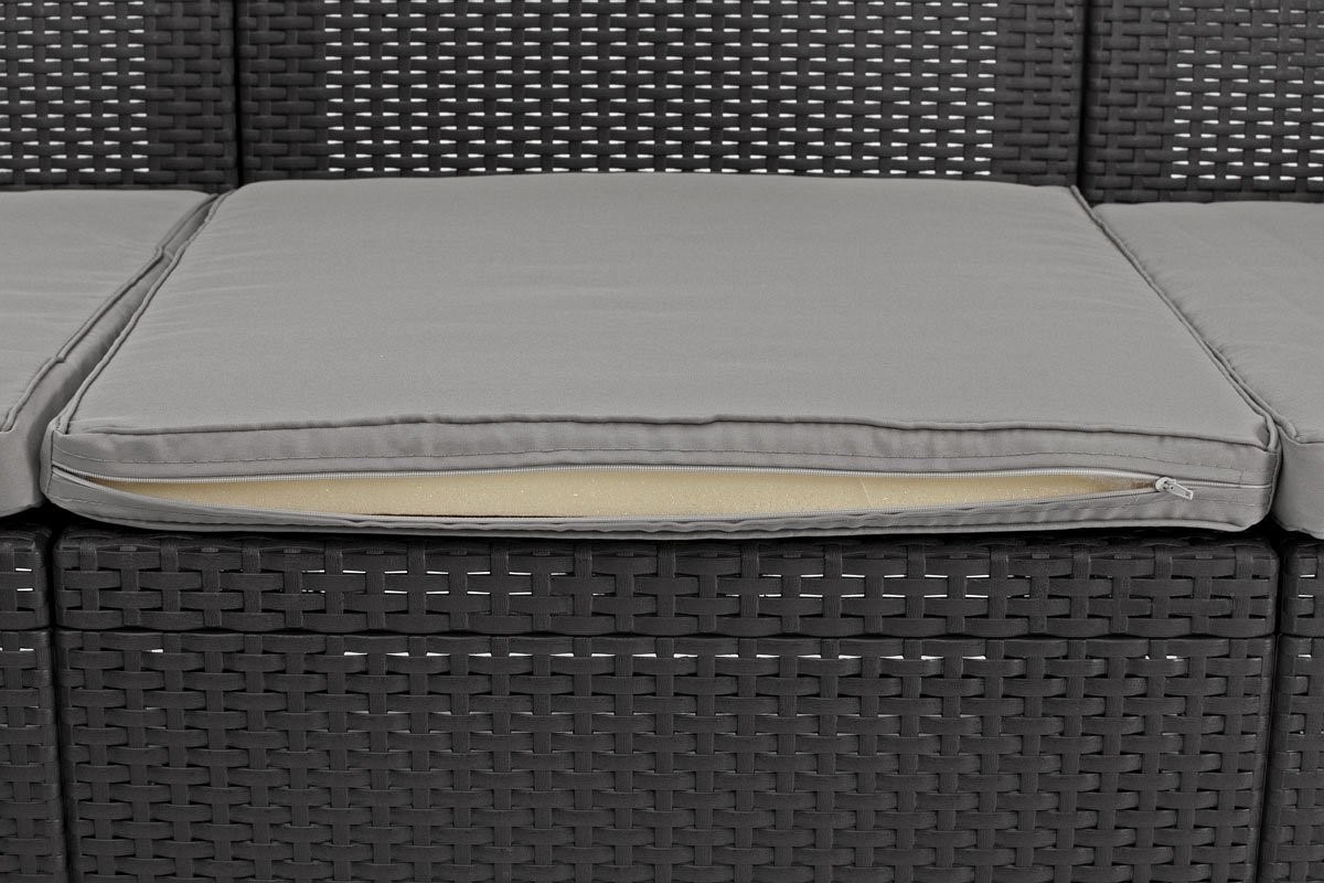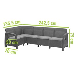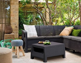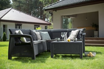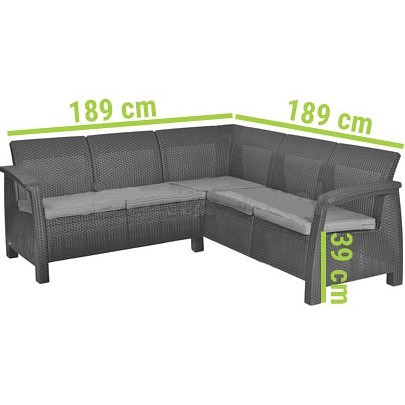 Narożnik tarasowy Corfu Relax to jeden z najpopularniejszych modeli marki Keter. Narożnik pochodzi z serii Corfu i idealnie komponuje się ze wszystkimi modelami z tej serii, zarówno pod względem kształtu, jak i koloru. Narożnik Corfu Relax zawiera nie tylko samą rogówkę z poduszkami, ale także praktyczny stolik kawowy. Cała seria stolików narożnych jest zachowana z wytłoczonym poliuretanowym wzorem. Piękne wykończenie to niewątpliwie ogromny atut tego komfortowego mebla, a użyte do jego produkcji wysokiej jakości surowce gwarantują wieloletnie i bezproblemowe użytkowanie. Wszystkie meble z serii Corfu posiadają filtry UV, dzięki czemu cieszą oko przez długi czas. Mebel ten nie wymaga specjalnej impregnacji ani czyszczenia.