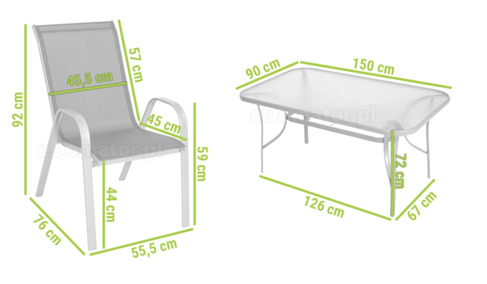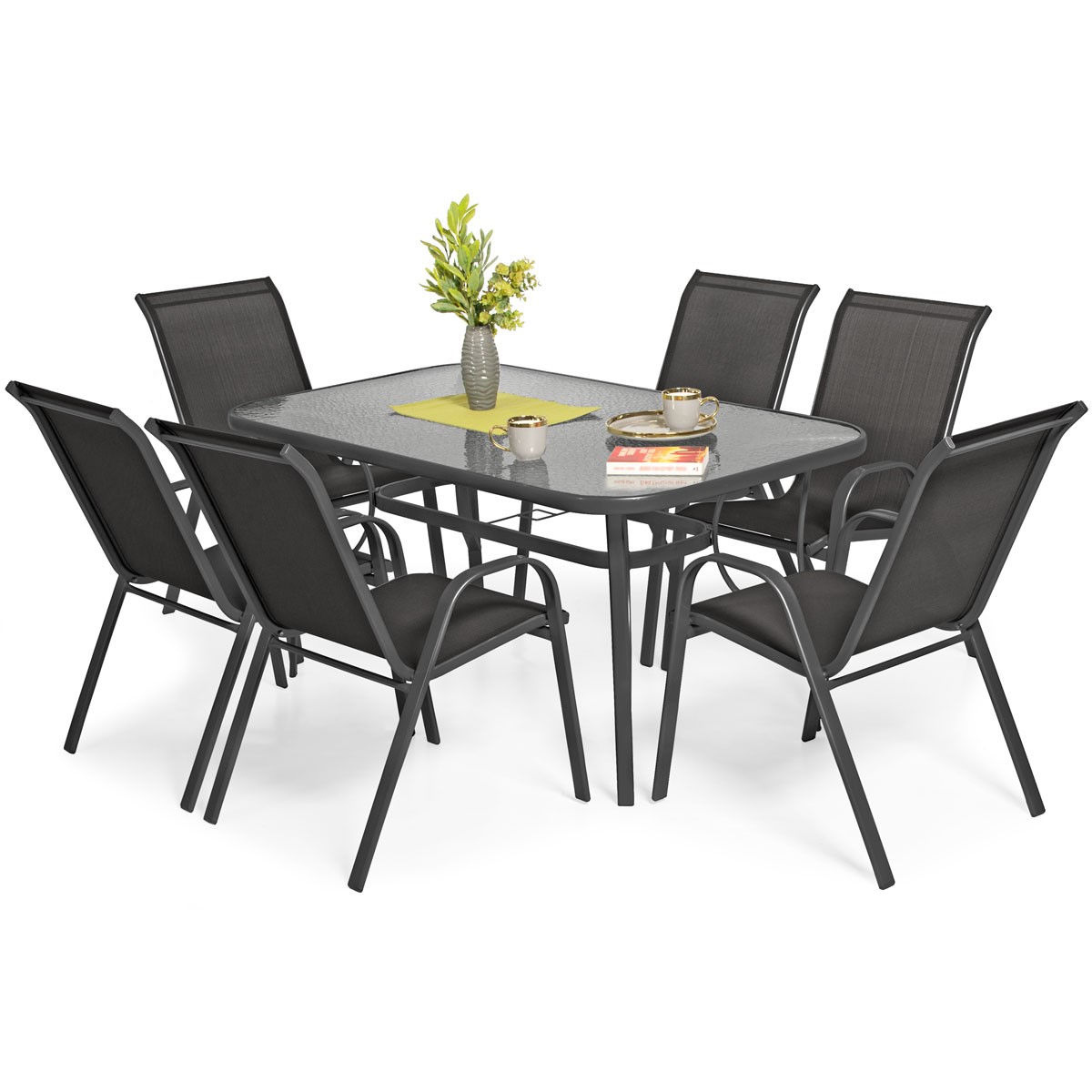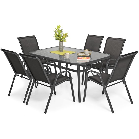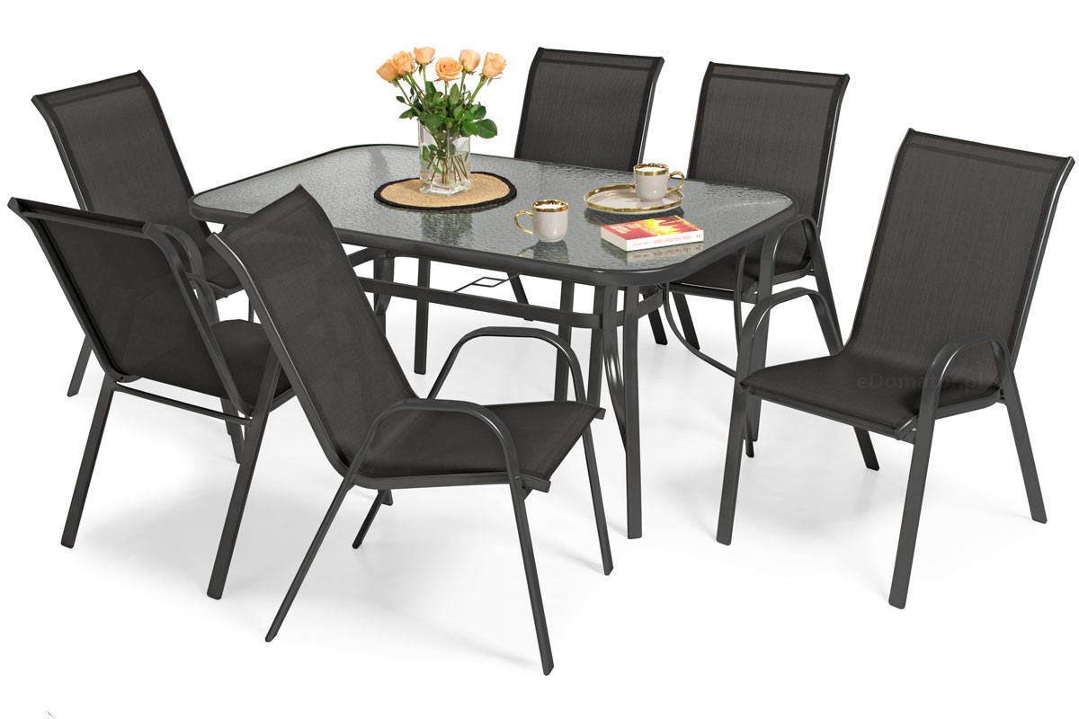 Zestaw mebli ogrodowych Porto, obejmujący stół i 6 krzeseł w eleganckim czarnym kolorze, to doskonała propozycja dla miłośników nowoczesnego designu. Wykonane z materiałów odpornych na warunki atmosferyczne, meble te gwarantują trwałość i łatwość w utrzymaniu. Ergonomiczne krzesła zapewniają komfort siedzenia, idealny na długie letnie wieczory, a przestronny stół jest perfekcyjny do rodzinnych posiłków i spotkań towarzyskich na świeżym powietrzu. Zestaw Porto to stylowa i praktyczna opcja dla każdego ogrodu, tarasu czy patio.