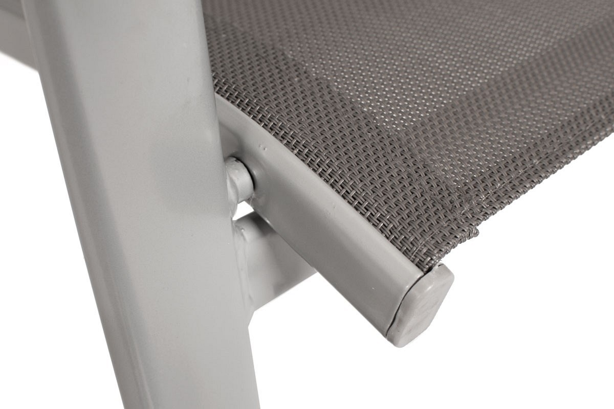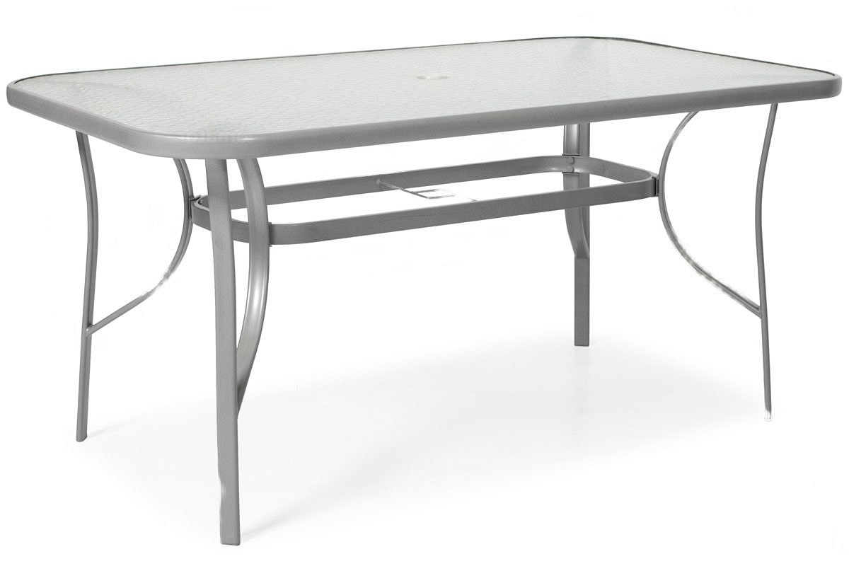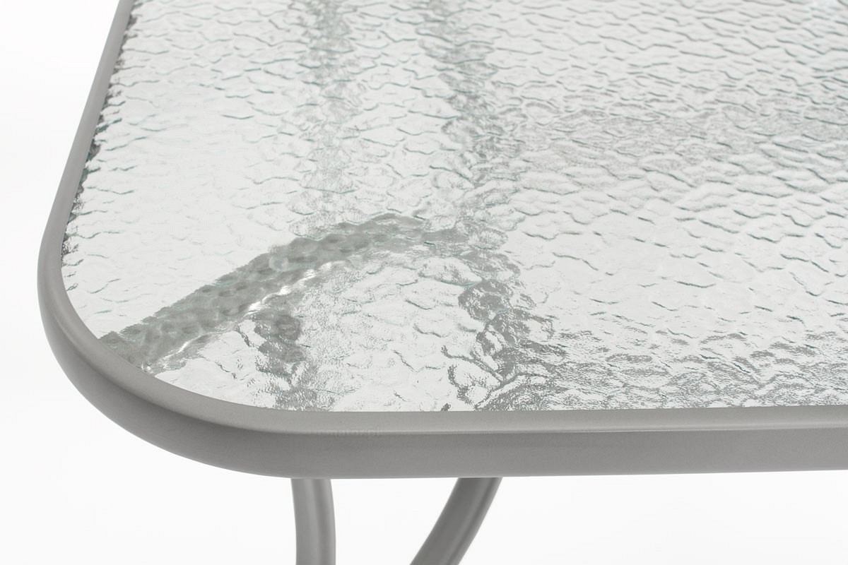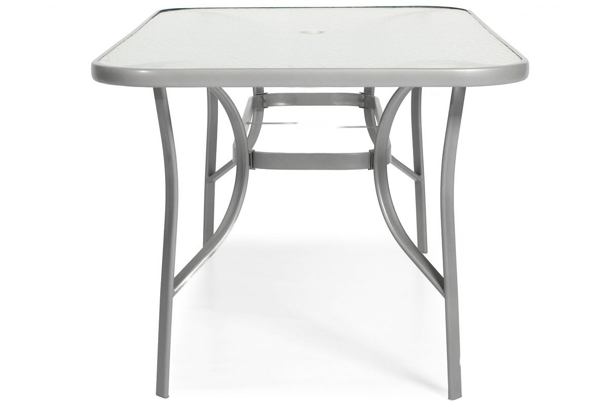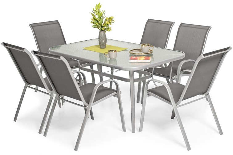Nowoczesny 6-osobowy zestaw ogrodowy PORTO składa się z: dużego stołu ogrodowego oraz sześciu wygodnych krzeseł. To praktyczny i wygodny mebel na taras, balkon lub do ogrodu. Obudowy mebli wykonane są ze stali malowanej proszkowo na jasnoszary odcień. Konstrukcja jest stabilna i wytrzymała. Obudowy meblowe wMeble posiadają delikatnie wygięte profile, które podkreślają nowoczesny styl serii. Stół należy złożyć samodzielnie, a krzesła są gotowe do użytku. Stół posiada prostokątny talerz wykonany ze szkła hartowanego o grubości 5 mm. Szkło ma ozdobną strukturę, a pośrodku górnej części znajduje się otwór na parasolkę o średnicy 4,5 cm. Fotel posiada bardzo wygodne tekstylne siedzisko. Jest to wodoodporny i trwały materiał, który idealnie nadaje się do użytku na zewnątrz. Pokrycie siedzenia jest wodoodporne i szybko schnie po deszczu. Fotel wyposażony jest w podłokietniki i wytrzymuje obciążenie do 120 kg.