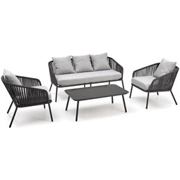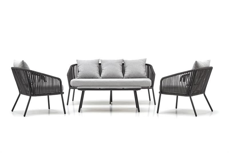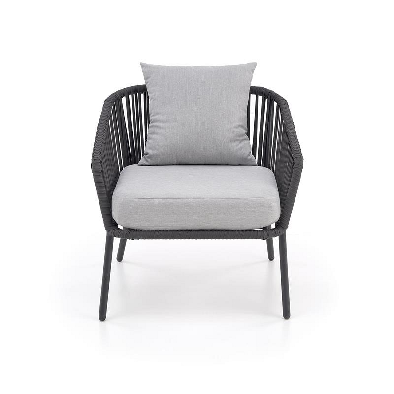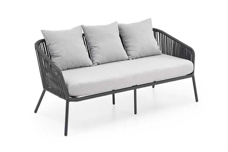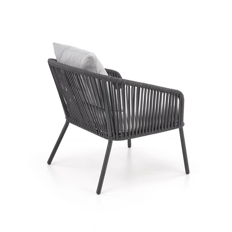 Zestaw Rocca składa się ze stolika kawowego, sofy i dwóch foteli. Materiały użyte do ich wykonania sprawiają, że meble te świetnie nadają się do użytku na zewnątrz. Nadają się do zastosowania w ogrodzie, ale także na tarasie czy altanie. Są praktyczne, a przy tym pięknie się prezentują. Kolorystyka użyta do ich wykończenia czyni je uniwersalnymi. Mały stolik kawowy spoczywa na czterech klasycznych niskich nogach. Wykonane są z aluminium malowanego proszkowo na ciemnoszary kolor. Blat jest prostokątny z zaokrąglonymi narożnikami i szkłem. Jako materiał ramy sofy i foteli, podobnie jak w przypadku stolika kawowego, użyto aluminium. Mebel ten posiada wysokie i smukłe nogi. Ich plecy są wysokie, a podłokietniki duże. Wykonane są z liny. Siedzisko każdego fotela ma prostokątne poduszki pokryte jasnoszarą tkaniną. Nieco mniejsze pełnią funkcję podparcia pleców. Obecność poduszek znacznie zwiększa komfort użytkowania prezentowanej serii.