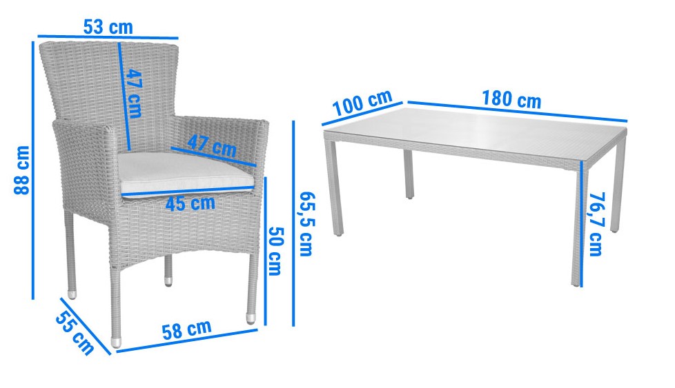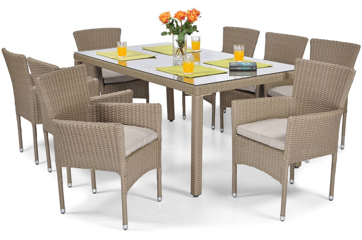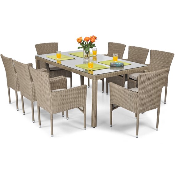 Zestaw mebli "Sanata" z technorattanu dla 8 osób w kolorze beżowym to elegancki wybór na zewnątrz, charakteryzujący się trwałością i łatwością w utrzymaniu. Składa się z dużego stołu i wygodnych krzeseł z poduszkami. Idealny na taras, ogród czy patio, zapewnia komfort i styl podczas spotkań w gronie rodziny i przyjaciół.