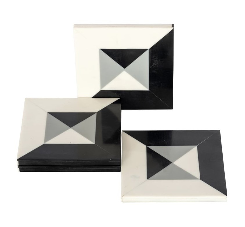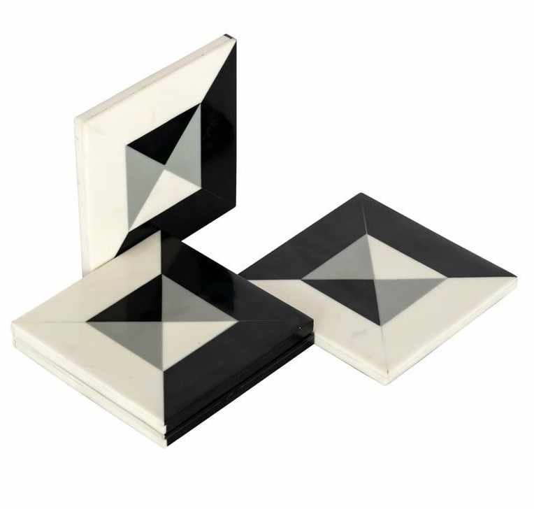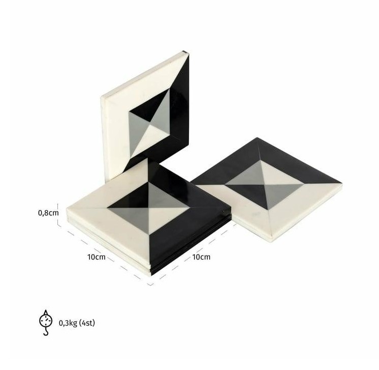 Ręcznie wykonany z żywicy czarno-biały zestaw w geometryczne wzory doskonale sprawdzi się w celu położenia kubków z napojem, a także udekorowania Twojej jadalni.