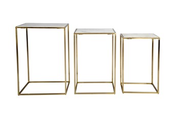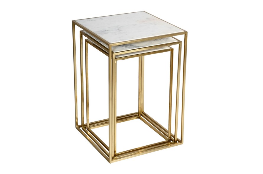 Zestaw stolików Avola AV2130-38 to eleganckie połączenie marmuru i metalu, które wnosi luksusowy charakter do wnętrza. Blaty wykonane z białego marmuru prezentują naturalną strukturę, która pięknie komponuje się z podstawą w złotym kolorze. Funkcjonalność zapewnia możliwość składania stolików, co sprawia, że są idealne do mniejszych przestrzeni.