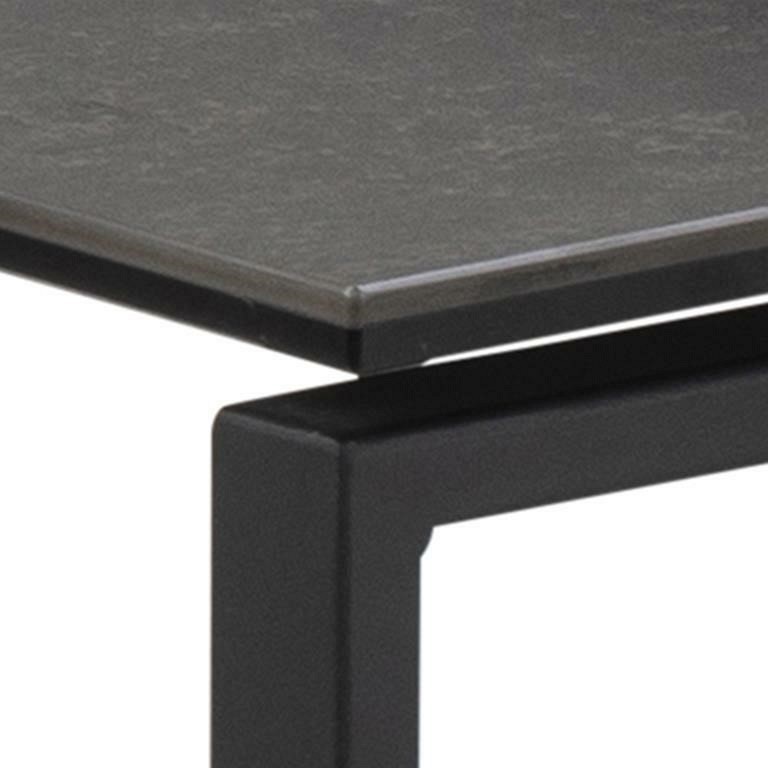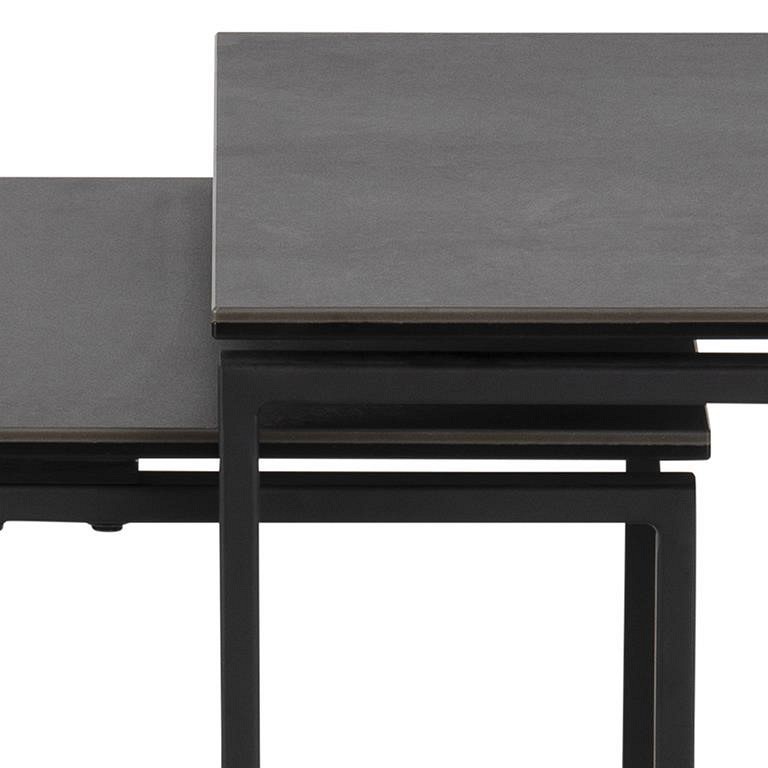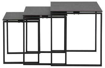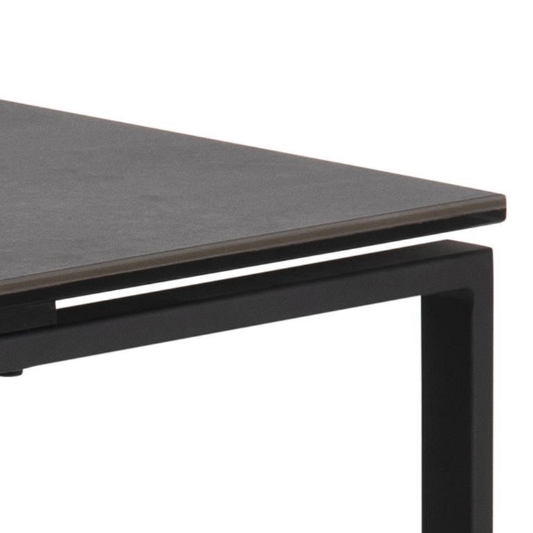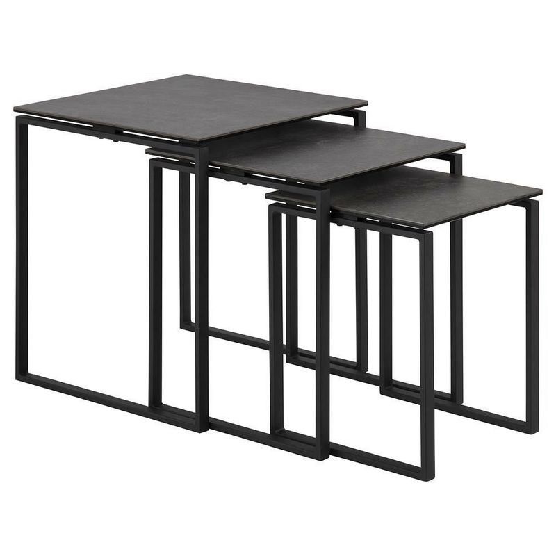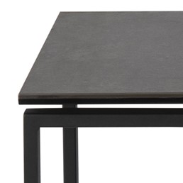 Nowoczesny zestaw stołowy Katrine zawiera trzy różnej wielkości stoły. Ponadczasowe połączenie metalu i ceramiki tworzy ciekawy egzemplarz. Kwadratowy blat porcelanowy o grubości 8 mm. Metalowe nogi stołu malowane proszkowo na czarno