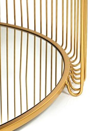 Szklane blaty w połączeniu z metalowym wykończeniem z mosiądzu tworzą harmonijną kompozycję, która doskonale odnajdzie się w nowoczesnych i awangardowych aranżacjach wnętrzowych.