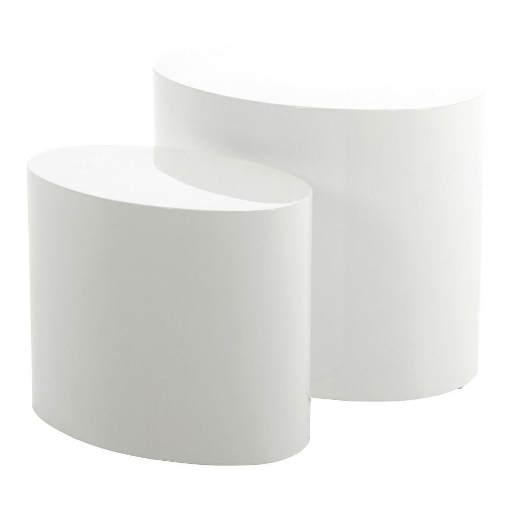 Zestaw stolików Mice w kolorze białym to nowoczesne i funkcjonalne uzupełnienie każdego wnętrza. Ich geometryczna forma przyciąga wzrok, a neutralna kolorystyka łatwo dopasowuje się do różnych aranżacji. Mogą pełnić funkcję stolików pomocniczych, nocnych lub kawowych.