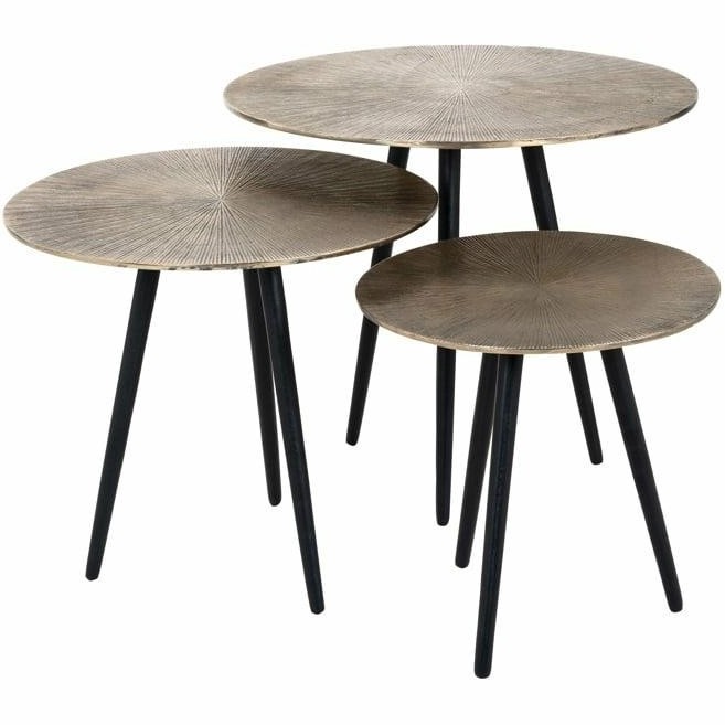 Zestaw stolików kawowych VITTORIO marki Richmond Interiors to harmonijne połączenie tradycji z nowoczesnością. Te okrągłe stoliki kawowe otrzymały nowoczesne odświeżenie, zachowując jednocześnie klasyczną estetykę. Aluminiowe blaty stolików imponują delikatną fakturą, która nadaje im subtelnego uroku. Wykończenie w antycznym złocie dodaje imponującego charakteru, podkreślonego przez trzy solidne, czarne metalowe nogi. Zestaw VITTORIO Richmond Interiors to nie tylko eleganckie meble, ale również wszechstronne. Ich funkcjonalność pozwala na ich używanie razem, tworząc spójną kompozycję, lub osobno, co umożliwia elastyczną aranżację przestrzeni w zależności od potrzeb i upodobań.
