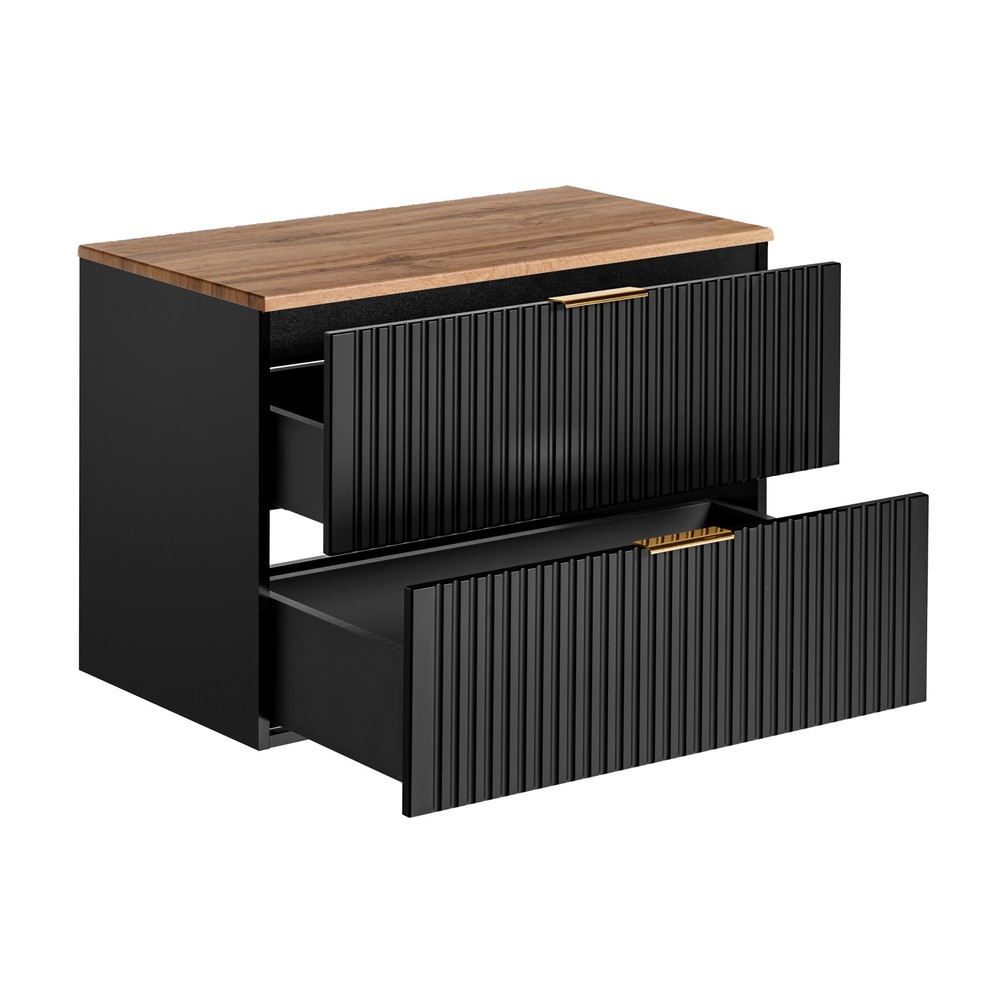 Zestaw szafki umywalkowej z blatem to idealne rozwiązanie dla osób ceniących elegancję oraz praktyczne wykorzystanie przestrzeni. Dzięki przemyślanej konstrukcji i stylowemu designowi, zestaw ten doda łazience wyjątkowego charakteru i uporządkuje przestrzeń. Szafki wykonane są z trwałej płyty laminowanej, odpornej na wilgoć i uszkodzenia mechaniczne, co zapewnia długowieczność mebli. Blat wykonany z wysokiej jakości materiałów, jest odporny na zarysowania i łatwy w utrzymaniu czystości, co czyni go praktycznym wyborem do łazienki. Szafki wyposażone są w przestronne szuflady, które umożliwiają przechowywanie kosmetyków, ręczników oraz innych niezbędnych akcesoriów łazienkowych, utrzymując je w porządku i zawsze pod ręką.