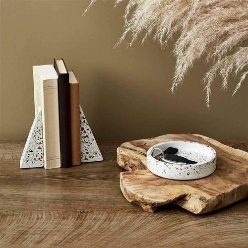 Zestaw Terrazzo to połączenie funkcjonalności i estetyki. Podpórki stabilizują książki na półce, a miseczka pozwala uporządkować drobne przedmioty – idealny dodatek do nowoczesnych wnętrz.