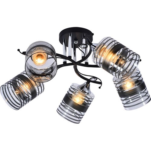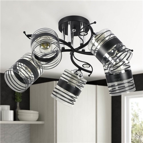 Żyrandol Aster 5 to niezwykła propozycja, stanowiąca efektowne wykończenie, które ozdobi i rozświetli każde pomieszczenie. Delikatny kształt oprawy, w połączeniu z pięcioma szklanymi kloszami o przeźroczystej strukturze, zdobionymi czarnym akcentem przypominającym spiralę, nadają lampie wyjątkowy urok. Wybierając ten piękny żyrandol, można być pewnym, że stanie się on niezwykłą dekoracją, przyciągającą uwagę każdego obserwatora. Optymalny rozstaw pięciu źródeł światła zapewnia komfortowe oświetlenie pomieszczenia. Model Aster 5 świetnie sprawdzi się w roli oświetlenia do salonu, jadalni, sypialni, garderoby, przedpokoju oraz biura, stanowiąc doskonały dodatek do eleganckich i nowoczesnych wnętrz. Solidna konstrukcja, precyzyjne wykonanie i wysokiej jakości materiały użyte do produkcji lampy zapewniają nie tylko estetyczny wygląd, ale także trwałość i funkcjonalność przez wiele lat.