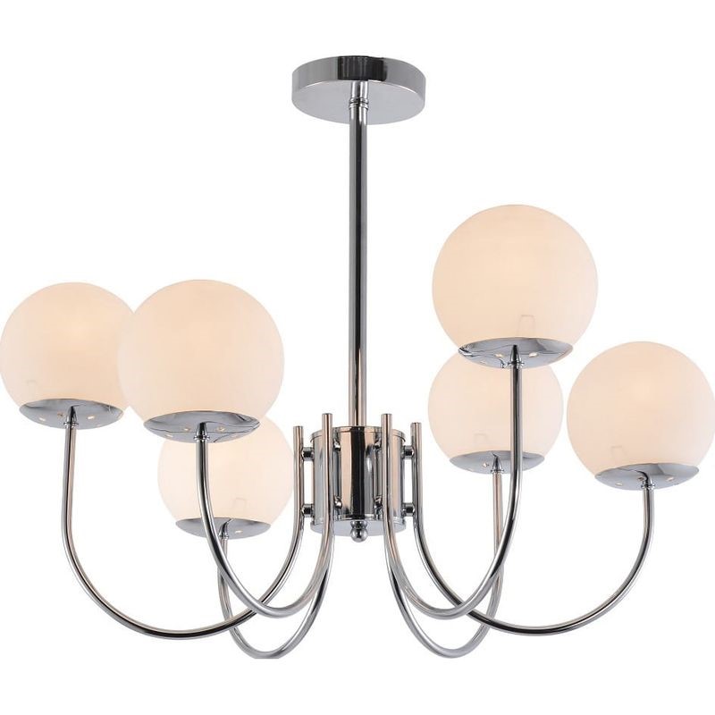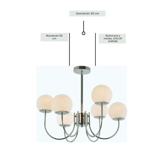 Freia to elegancki żyrandol o sześciu ramionach, dostępny w dwóch wykończeniach – chromowanym i złotym. To oświetlenie stworzone do wyrafinowanych wnętrz, w których liczy się szyk i efektowność. Konstrukcja łączy prostotę z luksusem, oferując jasne, ale przyjemne światło. Doskonały wybór do salonu, jadalni lub wnętrz hotelowych.