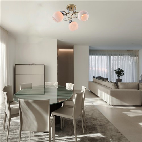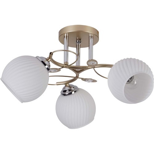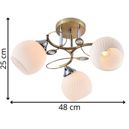 Żyrandol Goldio to niezwykle zjawiskowy model oświetleniowy, który zachwyca swoją unikalną formą. Połączenie pięknej formy złotego korpusu z trzema kloszami, wykonanymi z mlecznego, grubego szkła, sprawia, że całość lampy prezentuje się niezwykle efektownie. Ze względu na stonowaną, neutralną kolorystykę bieli i złota, żyrandol ten posiada ogromne możliwości aranżacyjne. Łatwo wkomponuje się w każdą estetykę wnętrza, stanowiąc doskonałą propozycję oświetlenia centralnego dla salonu, jadalni, sypialni, garderoby, kuchni oraz przedpokoju. Poprawny rozstaw trzech źródeł światła wypełni pomieszczenie jasnością, zapewniając komfort użytkowania. Użyte do produkcji żyrandola materiały najwyższej jakości oraz precyzyjne wykonanie pozwolą cieszyć się jego wyglądem i funkcją przez wiele lat.